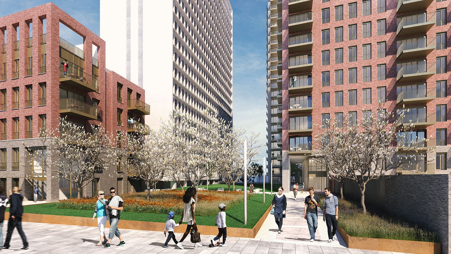 The scheme consists of three new build mixed-use and residential towers along with substantial public realm and green space. The residential element will offer a mix of 357 one, two, three and four bedroom units, of which 30% will be available through affordable housing.